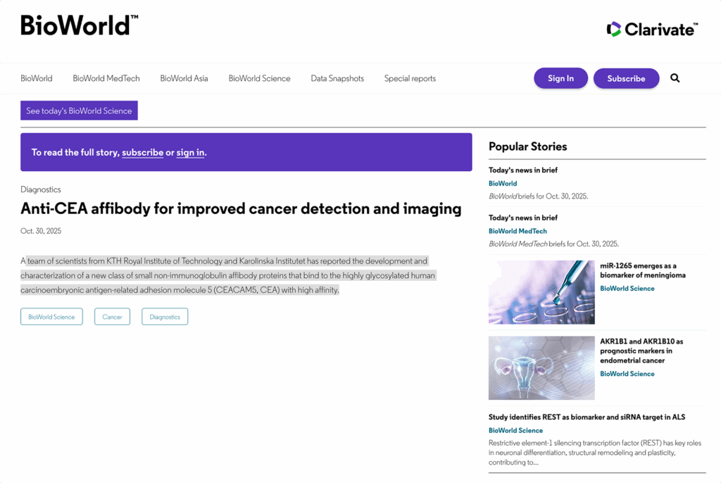 team of scientists from KTH Royal Institute of Technology and Karolinska Institutet has reported the development and characterization of a new class of small non-immunoglobulin affibody proteins that bind to the highly glycosylated human carcinoembryonic antigen-related adhesion molecule 5 (CEACAM5, CEA) with high affinity.